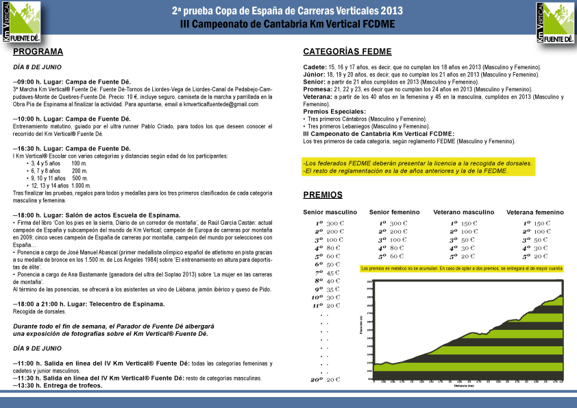La cuarta edición del Km Vertical® Fuente Dé y tercer Campeonato de Cantabria Km Vertical FCDME dará un gran paso en el camino de la consolidación de esta prueba a todos los niveles. Por el lado del aspecto competitivo, al formar parte del circuito de la Copa de España de Verticales ─será la segunda prueba de las tres previstas─, lo que, entre otras cosas, asegura el concurso de algunos de los mejores especialistas del país. El IV Km Vertical® Fuente Dé será también una de las tres carreras que el nuevo seleccionador nacional, Xavier Grau, tendrá en cuenta para elegir a nuestros representantes en las pruebas verticales de los próximos SkyGames que se disputarán en Italia.