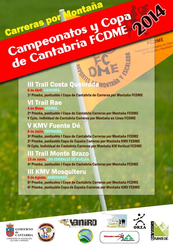 La principal novedad de la edición 2014 del Km Vertical® Fuente Dé, que se disputará el próximo 8 de junio, será su participación en un campeonato que organiza por primera vez la Federación Cántabra de Deportes de Montaña y Escalada: la I Copa de Cantabria Carreras por Montaña FCDME. El Km Vertical® Fuente Dé acogerá la tercera prueba puntuable de este campeonato individual combinado, que se completará con las siguientes carreras: III Trail Costa Quebrada (Liencres, 6 de abril), VI Trail RAE (Otañes, 4 de mayo), III Trail Monte Brazo (Los Corrales de Buelna, 15 de junio), III KMV Mosquiteru (Arredondo, 9 de agosto).
